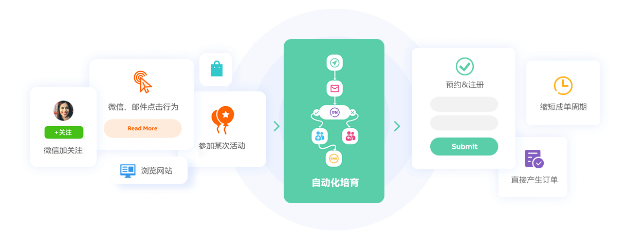 針對(duì)未留資客戶、已留資無(wú)明確意向的客戶、高意向潛客、活躍客戶、沉睡客戶等處于生命周期不同階段的用戶,可以制定與之相符的個(gè)性化培育策略,并通過(guò)郵件營(yíng)銷(xiāo)、短信營(yíng)銷(xiāo)、內(nèi)容營(yíng)銷(xiāo)、線上直播等多種觸達(dá)方式進(jìn)行個(gè)性化內(nèi)容培育,所有觸達(dá)皆可通過(guò)自動(dòng)化場(chǎng)景工作流完成。